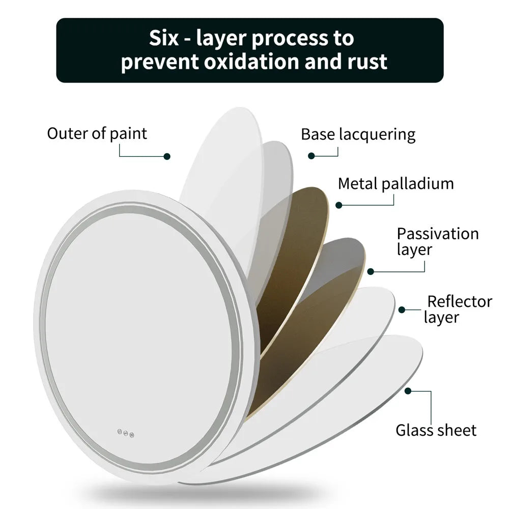 Gemaakt van kopervrij, milieuvriendelijk zilverglas en een aluminium frame. IP65 waterdicht ontwerp, ideaal voor badkamers, toiletruimtes en gastentoiletten. Slim touchscreen voor eenvoudige lichtregeling, met voor- en achtergrondverlichting voor optimale helderheid.